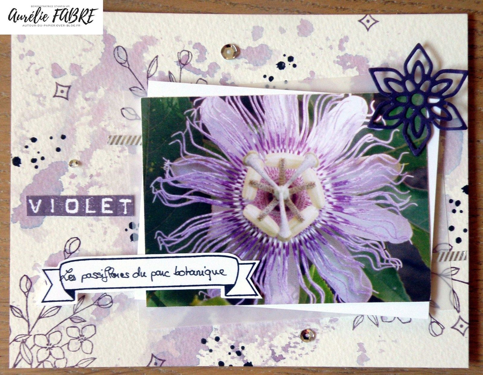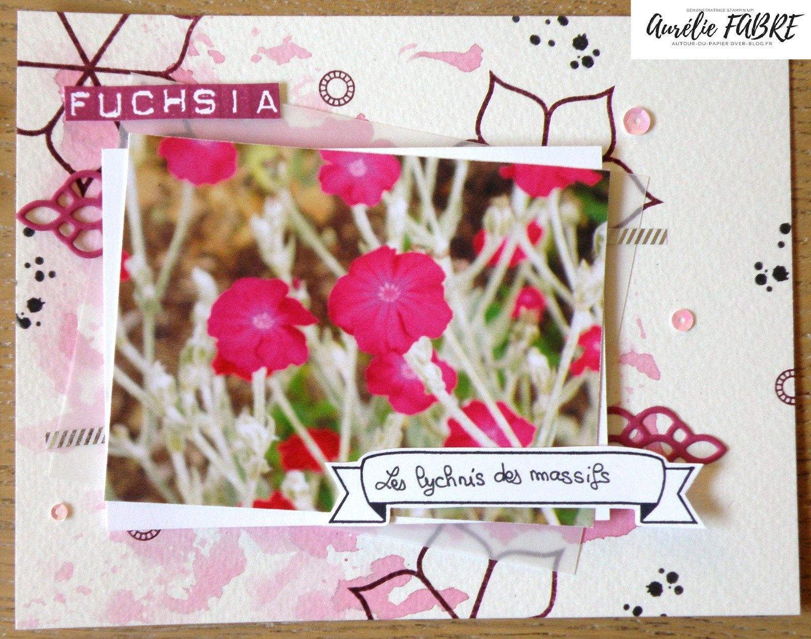 En ajoutant une couche de vélin sur les photos, plus besoin de pastilles 3D, le vélin donne l'illusion de profondeur, un bon moyen pour ne pas épaissir ce mini réalisé sur papier aquarelle. Enfin, en décoration, j'ai utilisé les assortiments de sequins du catalogue annuel et le ruban washi du kit d'embellissements Douce Soirée du catalogue Printemps Eté.